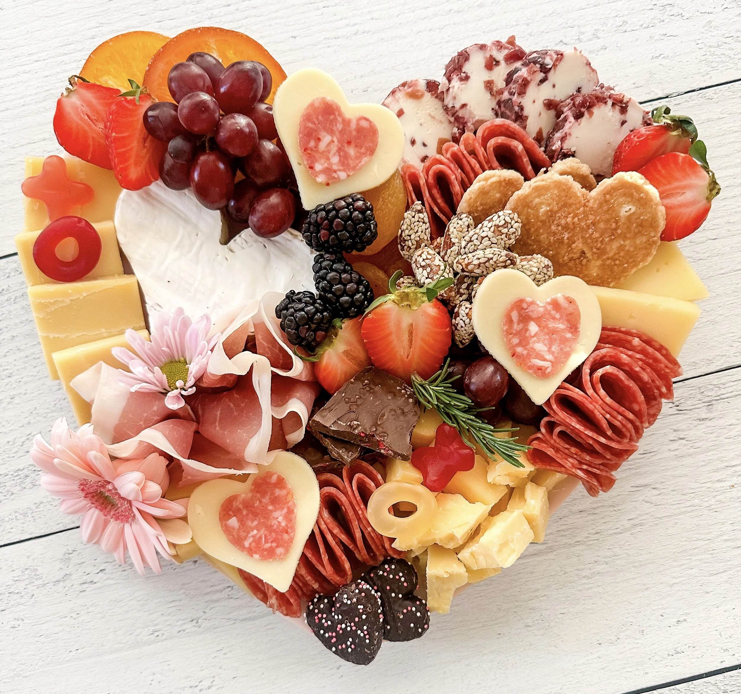 Our Valentine’s Day heart board is thoughtfully designed on a 11" x 9" melamine pink heart plate, (your keepsake) layered with a balance of creamy, savory artisan cheeses, charcuterie, fresh and dried fruits and a curated sweet mix of Valentine’s themed accompaniments.